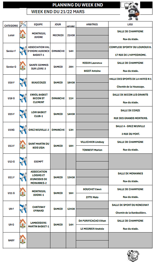 Planifier l’organisation des matchs. A réception des dates et du planning des matchs : (exemple de tableau ci-joint)